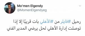 وكتب الجندي عبر حسابه الرسمي على تويتر: “رحيل فايلر من الأهلي بات قريبًا إلا إذا توصلت إدارة الأهلي لحل يرضي المدير الفني”.