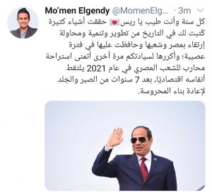 وقال الجندي عبر حسابه الرسمي على تويتر: “كل سنة وأنت طيب يا ريس.. حققت أشياء كثيرة كُتبت لك في التاريخ من تطوير وتنمية ومحاولة إرتقاء بمصر وشعبها وحافظت عليها في فترة عصيبة”.