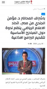 ونشرت الصفحة الرسمية للاتحاد على فيسبوك: “نظم الاتحاد الفلسطيني للاعلام الرياضي، بالتعاون مع رابطة النقاد الرياضيين المصرية، والأكاديمية الأولمبية الفلسطينية، ندوة رياضية عبر برنامج ZOOM، كانت بعنوان ” المبادئ الأساسية لتقديم البرامج الاذاعية”.