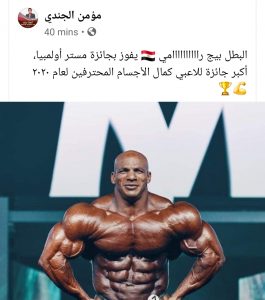 وقال الجندي عبر صفحته الرسمية على فيسبوك: “البطل بيج راااااااااامي يفوز بجائزة مستر أولمبيا”.