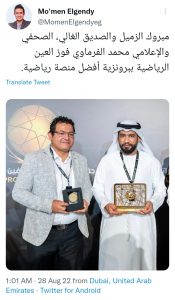 وقال الجندي عبر حسابه الرسمي على تويتر: “مبروك الزميل والصديق الغالي، الصحفي والإعلامي محمد الفرماوي فوز العين الرياضية ببرونزية أفضل منصة رياضية”.
