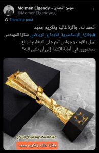 وكتب الجندي عبر حسابه الرسمي على X: “الحمد لله، جائزة غالية وتكريم جديد.. جائزة الإسكندرية للإبداع الرياضي، شكرًا للمهندس نبيل ياقوت وجولدن تيم على التنظيم الرائع! مستمرون في أمانة الكلمة إلى أن نلقى الله”.
